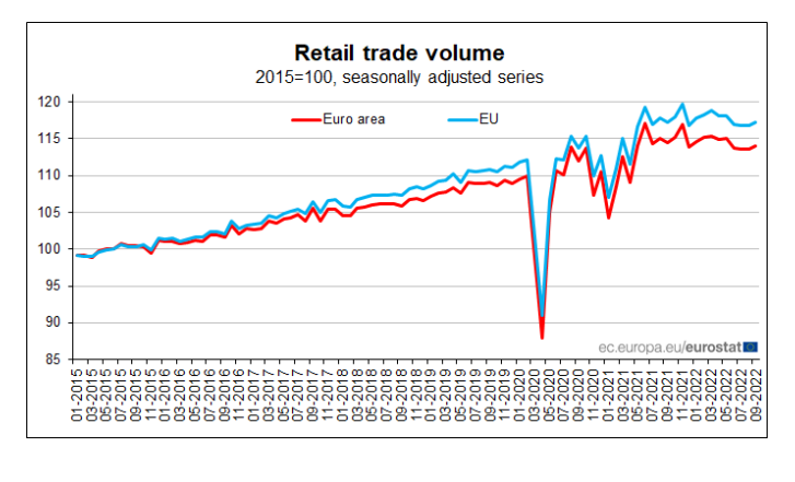 Τον Αύγουστο, ο όγκος του λιανικού εμπορίου παρέμεινε σταθερός τόσο στην ευρωζώνη όσο και στην ΕΕ. Σε ετήσια βάση, οι λιανικές πωλήσεις υποχώρησαν 0,6% στην ευρωζώνη και κατά 0,3% στην ΕΕ.