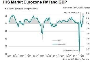 H επιχειρηματική δραστηριότητα της ευρωζώνης συνέχισε να αυξάνεται με ένα από τα πιο ισχυρά ποσοστά των τελευταίων δύο δεκαετιών τον Αύγουστο, με τον ρυθμό να κατεβάζει μόνο ελαφρώς ταχύτητα, παρά τις ευρείς καθυστερήσεις στις εφοδιαστικές αλυσίδες.