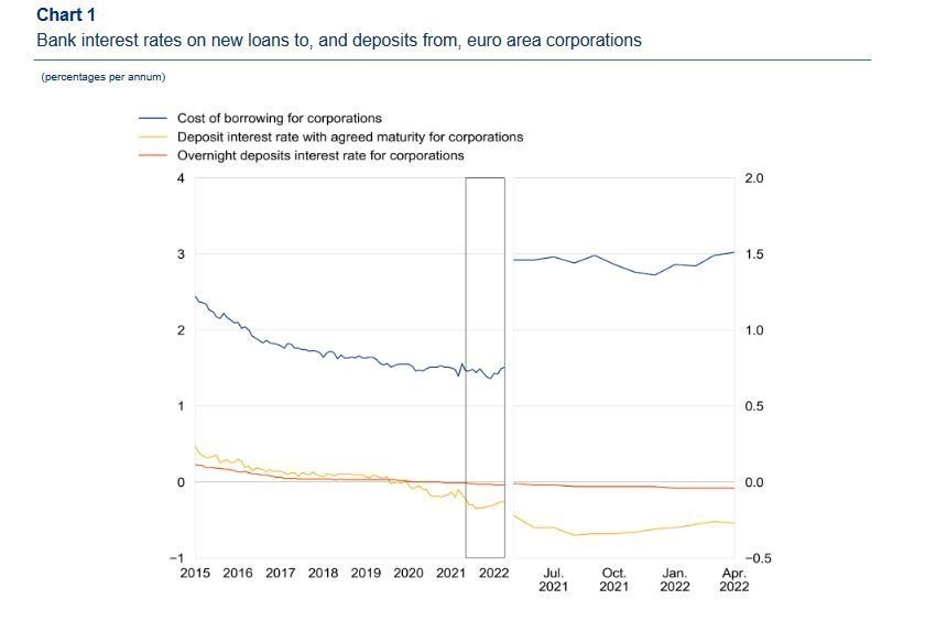 Το μέσο επιτόκιο νέων προθεσμιακών καταθέσεων από επιχειρήσεις παρέμεινε ουσιαστικά αμετάβλητο στο -0,27%, όπως αμετάβλητο στο -0,04% παρέμεινε και το μέσο επιτόκιο για καταθέσεις όψεως των επιχειρήσεων.