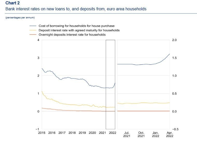 Για τα νοικοκυριά, το μέσο επιτόκιο για προθεσμιακές καταθέσεις παρέμεινε ουσιαστικά αμετάβλητο στο 0,24%, ενώ αμετάβλητο στο 0,01% διατηρήθηκε και το μέσο επιτόκιο καταθέσεων όψεως.