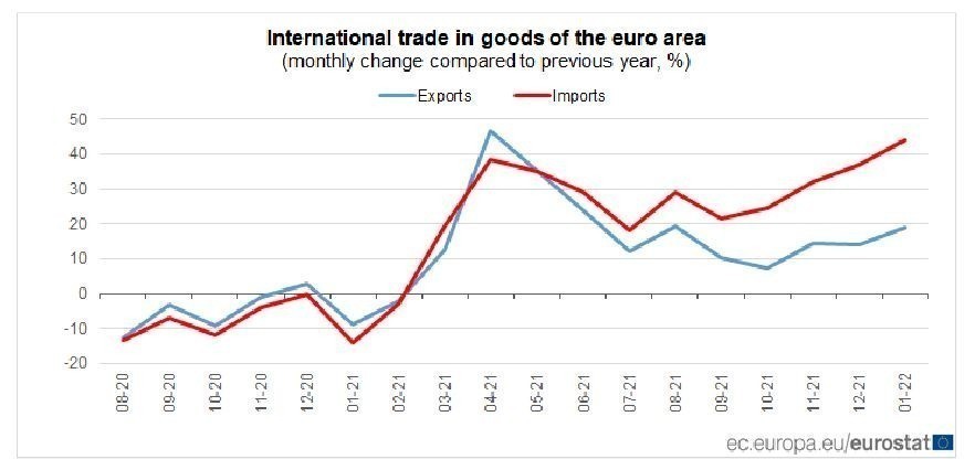 Συνεπώς, στην Ευρωζώνη σημειώθηκε έλλειμμα 27,2 δισ. ευρώ στις εμπορικές συναλλαγές αγαθών με τον υπόλοιπο κόσμο τον Ιανουάριο του 2022, σε σύγκριση με πλεόνασμα 10,7 δισ. ευρώ τον Ιανουάριο του 2021. Το εμπορικές συναλλαγές εντός της ζώνης του ευρώ αυξήθηκαν στα 192,3 δισ. ευρώ τον Ιανουάριο του 2022, υψηλότερα κατά 24,2% σε σύγκριση με τον Ιανουάριο του 2021.