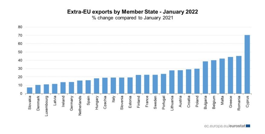 Τον Ιανουάριο του 2022, σε σύγκριση με τον Ιανουάριο του 2021, όλα τα κράτη μέλη κατέγραψαν μεγάλη αύξηση στις εξαγωγές εκτός Ευρωπαϊκής Ένωσαης. Οι υψηλότερες αυξήσεις καταγράφηκαν σε Κύπρο (+70,5%), Ρουμανία (+45,2%), Ελλάδα (+44,1%), Μάλτα (42,1%) και το Βέλγιο (+40,1%).