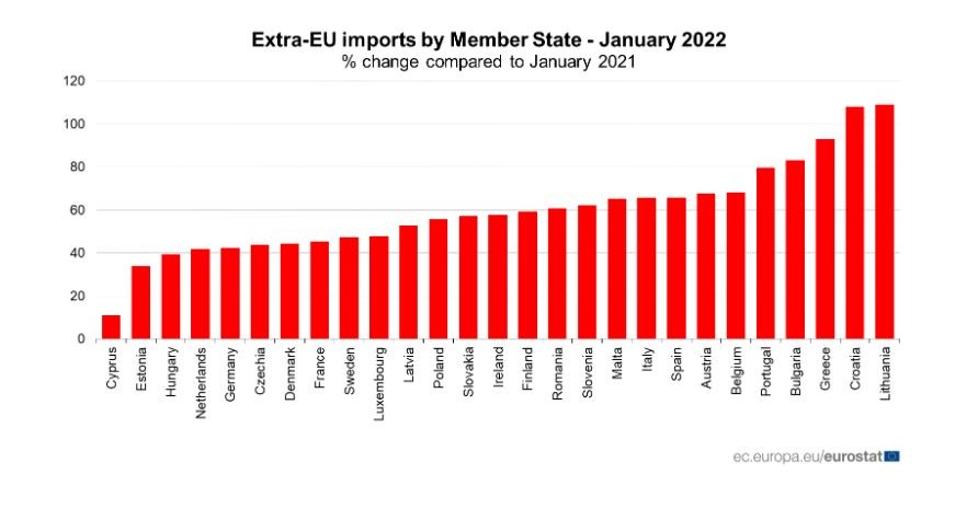 Όσον αφορά τις εισαγωγές εκτός ΕΕ, όλα τα κράτη μέλη κατέγραψαν σημαντική αύξηση των εισαγωγών εκτός ΕΕ . Οι υψηλότερες αυξήσεις παρατηρήθηκαν σε Λιθουανία (+109,0%) και Κροατία (+108,2%).