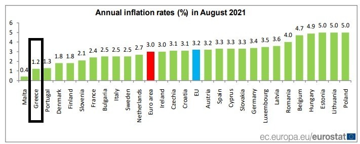 Όσον αφορά στην Ελλάδα, ο ετήσιος πληθωρισμός ανήλθε στο 1,2%, με τη χώρα μας να καταγράφει τη δεύτερη πιο αδύναμη επίδοση από τις χώρες της Ευρωζώνης (Μάλτα +0,4%). Η Πορτογαλία, από την πλευρά της, εμφάνισε πληθωρισμό 1,3%.