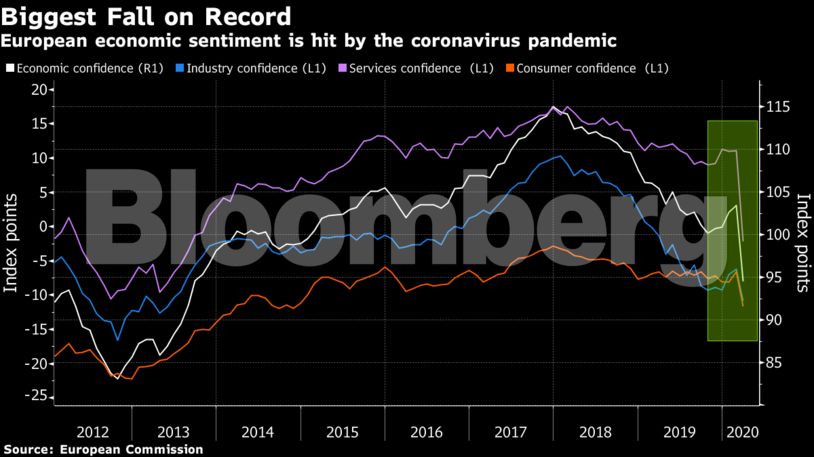 Το οικονομικό κλίμα στη ζώνη του ευρώ κατέγραψε τη μεγαλύτερη επιδείνωση στην ιστορία του σχετικού δείκτη, καθώς η ξέφρενη εξάπλωση του κορονοϊού ανάγκασε τις επιχειρήσεις σε τεράστιες περιοχές της Ευρωζώνης να κλείσουν την ώρα που οι ελπίδες για γρήγορη επιστροφή στην κανονικότητα μειώνονται.