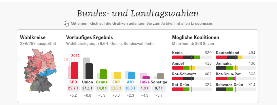 Μετά από 16 χρόνια απόλυτης κυριαρχίας της Άνγκελα Μέρκελ, η Χριστιανική Ένωση βυθίζεται σε ιστορικά χαμηλά επίπεδα και το SPD γίνεται το ισχυρότερο κόμμα με 25,7 %, ωστόσο όλα σχεδόν εξαρτώνται από τους Πράσινους και τους Φιλελεύθερους του FDP.