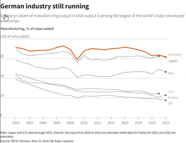 Άλλωστε, η μεταποίηση αποτελεί το 20% της γερμανικής οικονομικής δραστηριότητας, ποσοστό που παραμένει πολύ υψηλότερο από το 16% που είναι ο μέσος όρος της Ευρωπαϊκής Ένωσης. «Το μερίδιο της βιομηχανίας είναι σε μεγάλο βαθμό σταθερό, παραμένοντας σε ένα πολύ, πολύ υψηλό επίπεδο», λέει στο Reuters ο οικονομολόγος του Ifo Institute, Timo Wollmershaeuser. «Δεν έχει συμβεί κάτι τα τελευταία χρόνια που να με προβληματίζει».