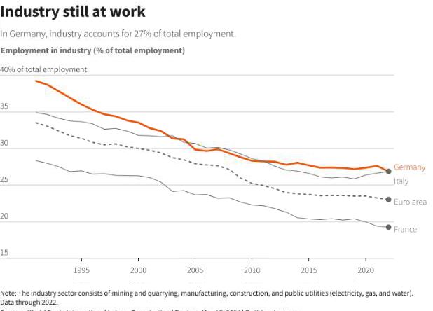 Η μεταποίηση ευθύνεται για το 27% της συνολικής απασχόλησης στη Γερμανία, ποσοστό που έχει μειωθεί από το 32% που ήταν πριν από 20 χρόνια, όμως παραμένει το μεγαλύτερο με διαφορά στις μεγάλες ευρωπαϊκές οικονομίες, με μοναδική εξαίρεση την Ιταλία.