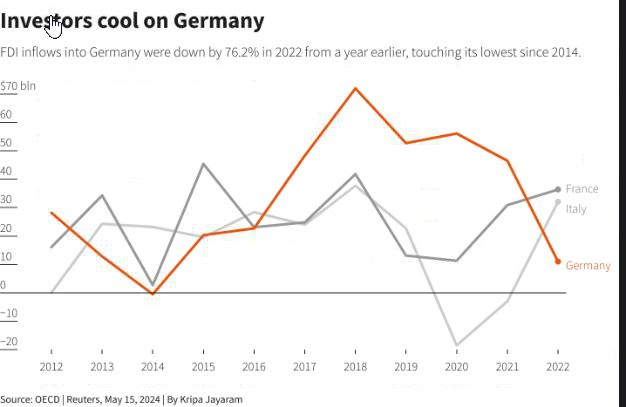 Οι άμεσες ξένες επενδύσεις στη Γερμανία εμφάνισαν μείωση 12% στα projects πέρυσι, δείχνει έρευνα της EY, ενώ το ινστιτούτο IW υπολογίζει ότι ξένες επιχειρήσεις επένδυσαν μόνο 22 δισ. ευρώ στη Γερμανία το 2023, το χαμηλότερο ποσό των τελευταίων 10 ετών.