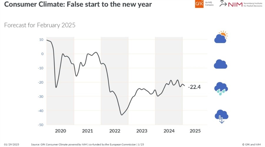 Κακή αρχή έκανε για το 2025 η καταναλωτική εμπιστοσύνη στη Γερμανία τον Ιανουάριο, καθώς μειώθηκαν οι οικονομικές και οι εισοδηματικές προσδοκίες, σύμφωνα με την τελευταία έρευνα GfK Consumer Climate που δημοσιεύθηκε από την GfK SE και το Ινστιτούτο Αποφάσεων Αγοράς της Νυρεμβέργης (NIM). Παράλληλα, μειώθηκε η διάθεση των καταναλωτών για αγορές.