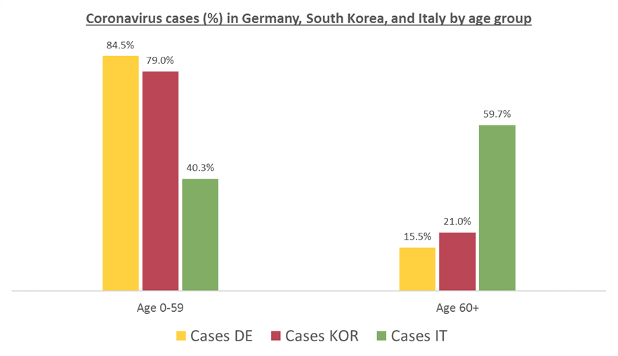 Βάσει αυτής της σύγκρισης, η Γερμανία ήταν μέχρι στιγμής «πιο τυχερή» από την Νότιο Κορέα μέχρι τώρα, καθώς ο κορωναϊός προφανώς έχει εξαπλωθεί μεταξύ του νεότερου γερμανικού πληθυσμού.