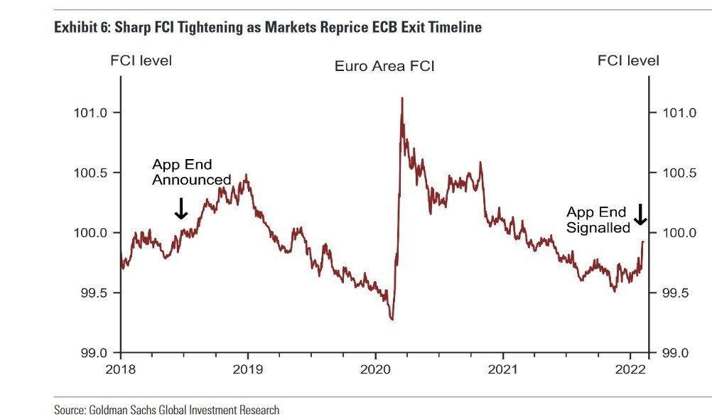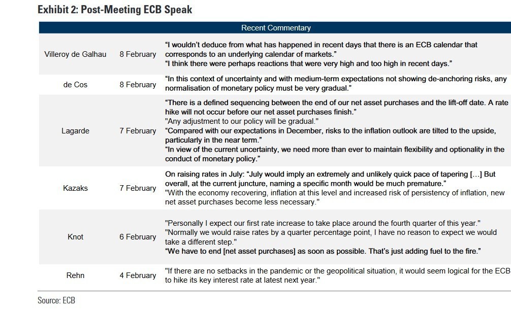 Σύμφωνα με την Goldman Sachs, το Διοικητικό Συμβούλιο της ΕΚΤ θα άρει το πρόγραμμα αγοράς ομολόγων τον Ιούνιο. Παράλληλα, θα αυξήσει τα επιτόκια καταθέσεων στο 0% με δύο συνεχόμενες αυξήσεις 25 μονάδων βάσης κατά τη διάρκεια των συναντήσεων του Σεπτεμβρίου και του Δεκεμβρίου. Παρεμφερείς είναι και οι πρόσφατες εκκλήσεις των μελών του Δ.Σ. της κεντρικής τράπεζας, Νοτ και Κάζακς για ταχύτερη άρση του QE και αύξηση των επιτοκίων το 4ο τρίμηνο του έτους.