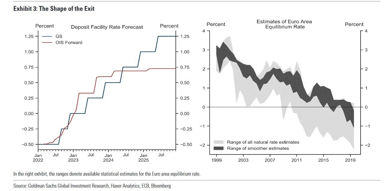 Σε μακροπρόθεσμο επίπεδο, oι αναλυτές της Goldman αναμένουν αυξήσεις των επιτοκίων κάθε Ιούνιο και Δεκέμβριο μέχρι το τέλος του α’ εξαμήνου του 2025, όπου τα επιτόκια θα βρίσκονται στο 1,25%.