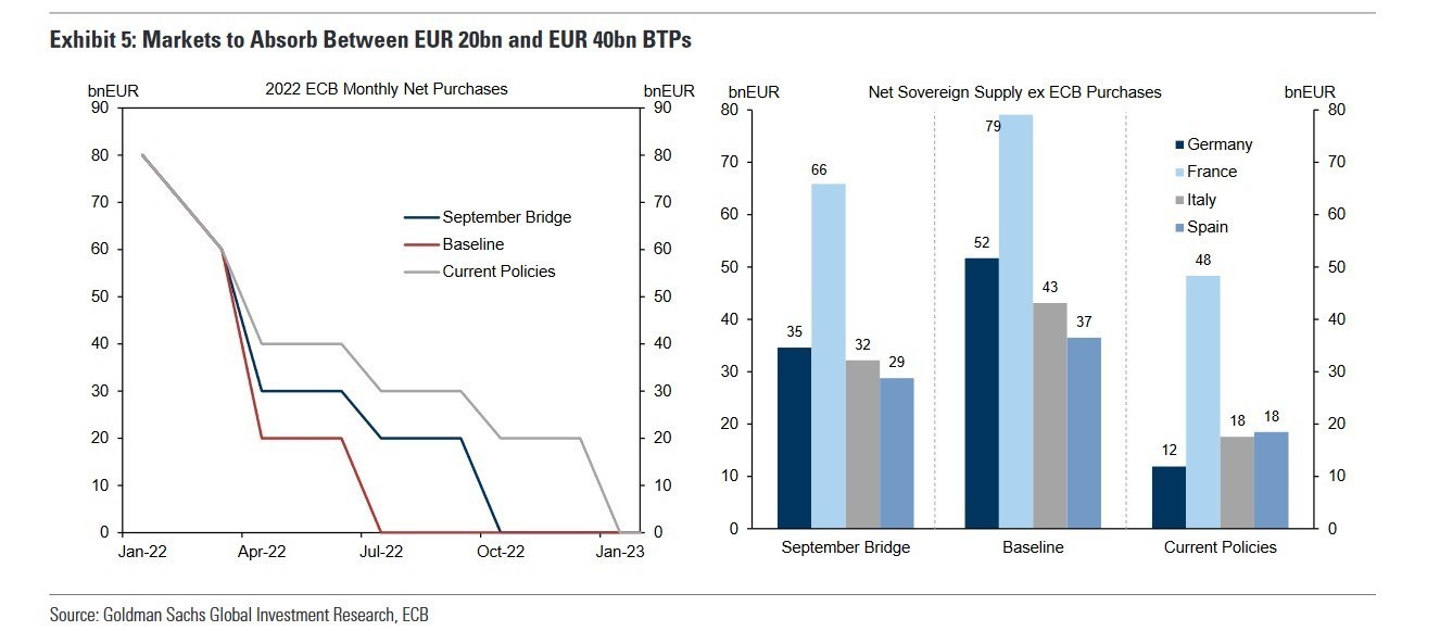 Τα τρία σενάρια της Goldman Sachs όσον αφορά την άρση του προγράμματος αγοράς ομολόγων (APP) είναι τα εξής: επιτάχυνση άρσης του προγράμματος τον Ιούνιο, επιτάχυνση άρσης τον Σεπτέμβριο, ή ακολούθηση του παρόντος σχεδίου με άρση του προγράμματος τον Οκτώβριο.