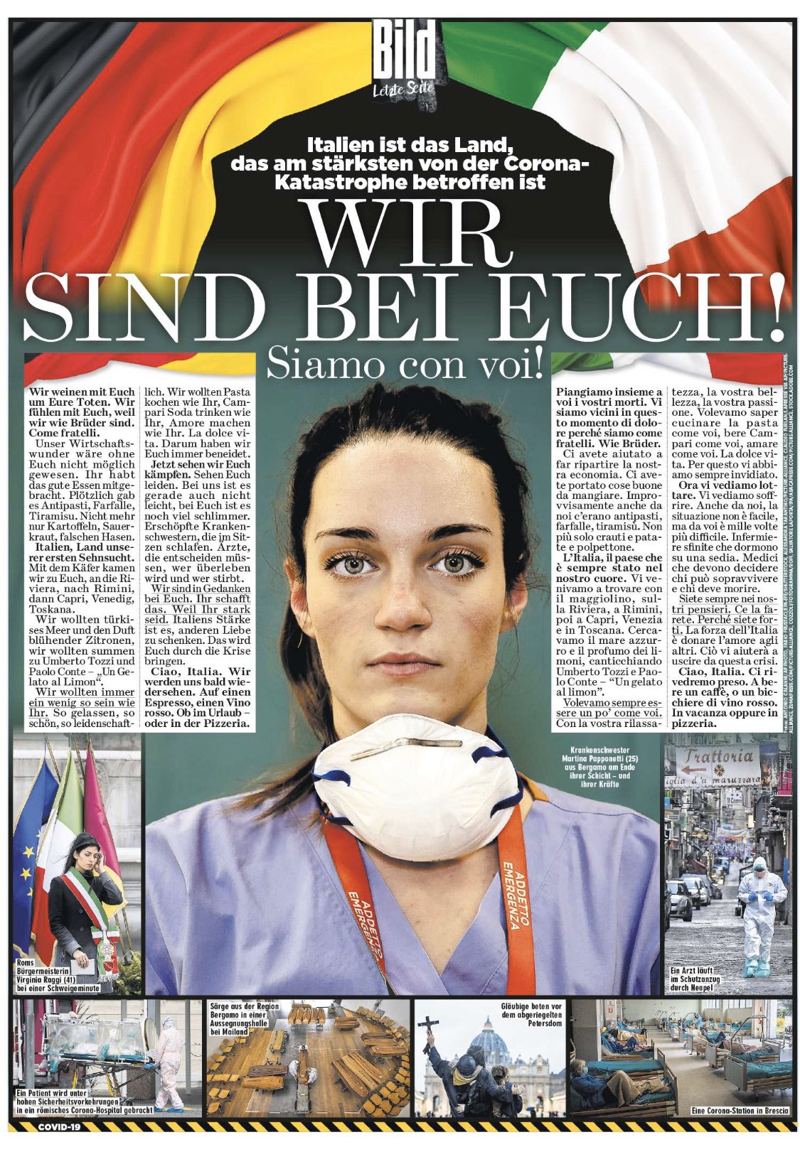 Σε μια ολόκληρη σελίδα ο πηχαίος τίτλος είναι “Ιταλία, είμαστε μαζί σας” στεφανωμένος με τις σημαίες της Γερμανίας και της Ιταλίας και τη μετάφραση “Siamo con voi” να ακολουθεί. Η βασική εικόνα είναι το καθαρό πρόσωπο μιας Ιταλίδας νοσηλεύτριας ενώ το άρθρο εικονογραφείται με επιπλέον φωτογραφίες από το ιταλικό δράμα, φέρετρα, άδειες πλατείες και εικόνες από τη μάχη των γιατρών στα νοσοκομεία.
