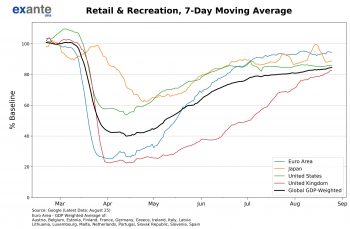 Ο δείκτης του σταθμισμένου ΑΕΠ στη Λιανική και την Ψυχαγωγία, η οποία αντανακλά κατά πόσο ο κόσμος καταναλώνει και ψυχαγωγείται μετά το lockdown εμφανίζει σε όλο τον κόσμο μια υστέρηση -15,3% έναντι των επιπέδων προ κορωνοϊού.