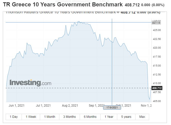 H παρέμβαση της επικεφαλής της ΕΚΤ οδηγεί σε νέα αποκλιμάκωση την αγορά ομολόγων, με το ελληνικό δεκαετές ομόλογο να βρίσκεται στις 408,712 μονάδες βάσεις.