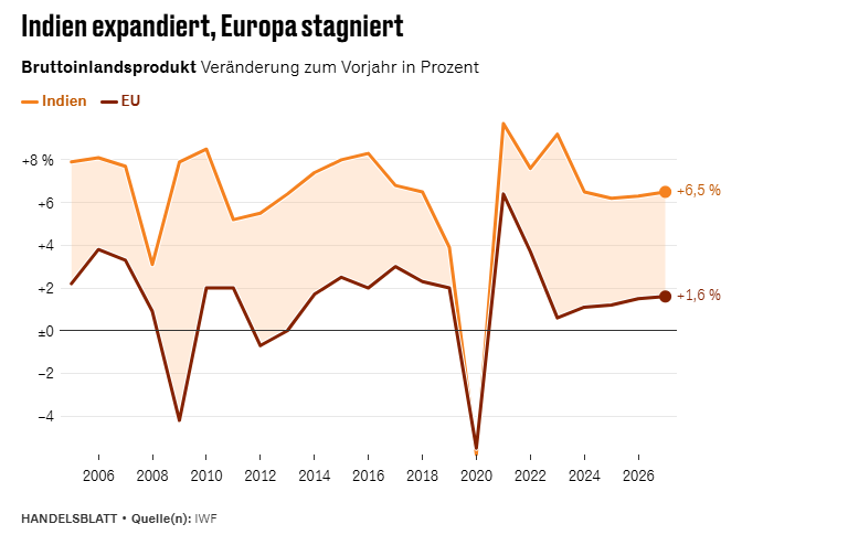 Η Ινδία επωφελείται ιδιαίτερα από τη συμφωνία, επειδή επηρεάζεται από πρόσθετους δασμούς 50% που επιβάλλονται από τις ΗΠΑ. Αυτοί οι δασμοί κοστίζουν στην Ινδία το 1,6% του ΑΕΠ της ετησίως, σύμφωνα με υπολογισμούς ερευνητών στο Κίελο, που επικαλείται η Handelsblatt. Αυτό αντιστοιχεί σε συνολική ετήσια απώλεια παραγωγής περίπου 57 δισεκατομμυρίων δολαρίων ΗΠΑ.
