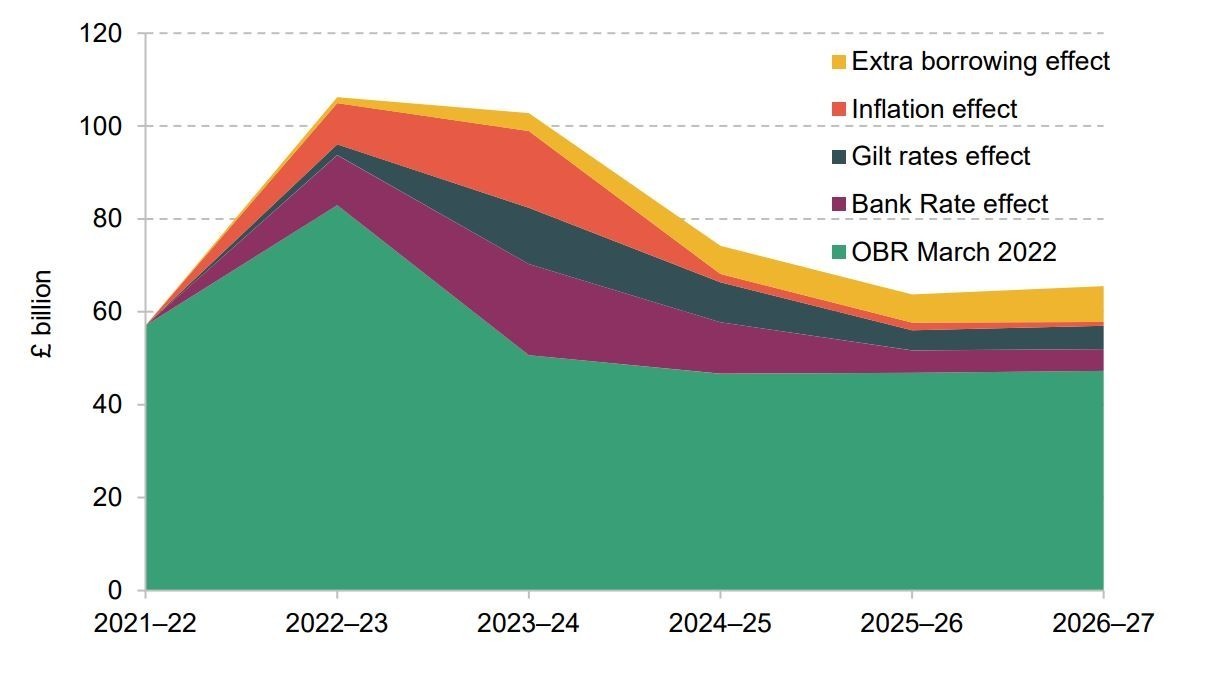 οι δαπάνες για τόκους χρέους θα φτάσουν στα £103 δισεκατομμύρια το 2023-24, ποσό διπλάσιο από τα £51 δισεκατομμύρια που είχε προβλέψει το Γραφείο Προϋπολογισμού (OBR) τον Μάρτιο