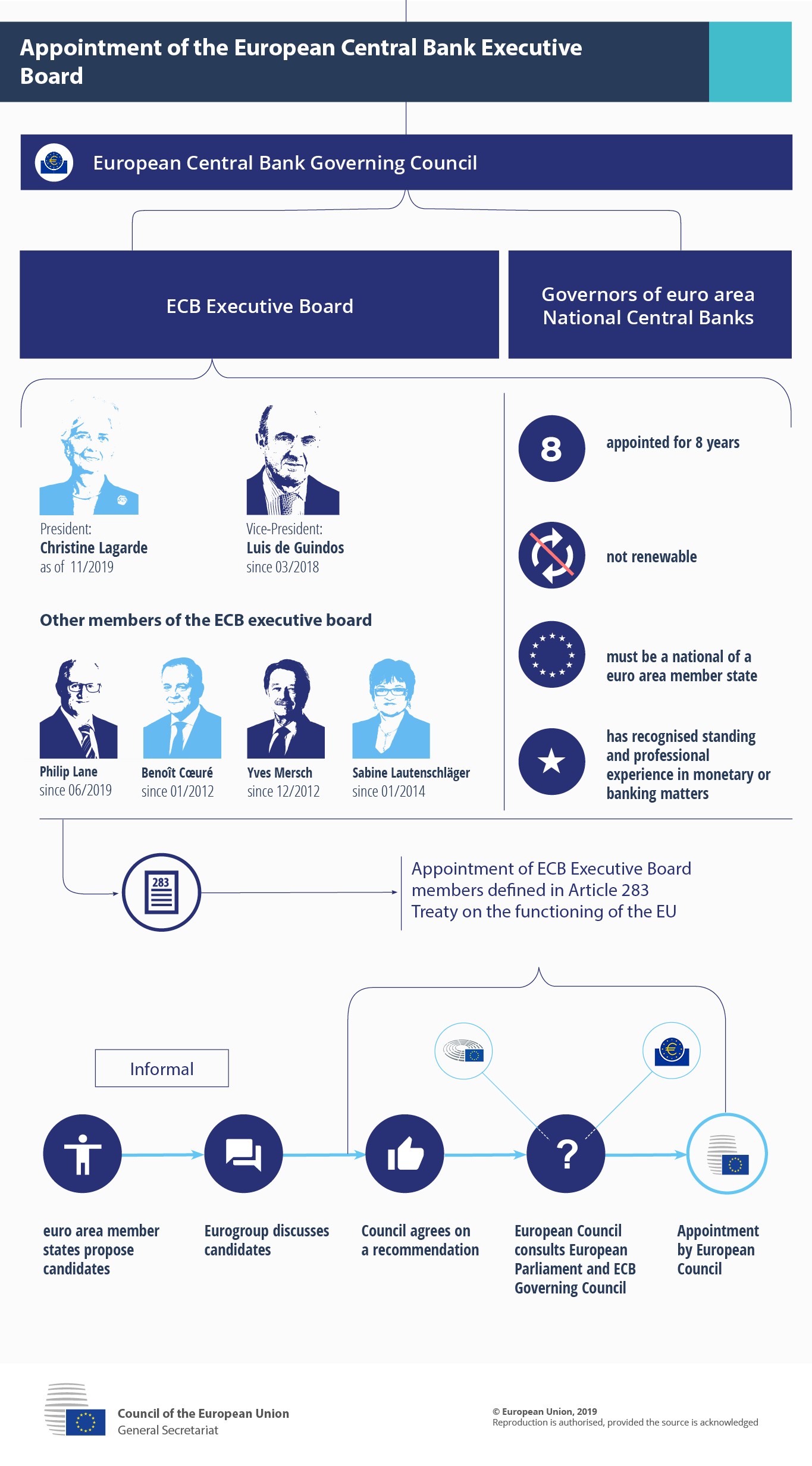 Στις 2 Ιουλίου 2019, το Ευρωπαϊκό Συμβούλιο εξέτασε την κ. Κριστίν Λαγκάρντ ως την κατάλληλη υποψήφια για την προεδρία της Ευρωπαϊκής Κεντρικής Τράπεζας. Το Συμβούλιο (Οικονομικές και Δημοσιονομικές Υποθέσεις) εξέδωσε επίσημη σύσταση στις 9 Ιουλίου 2019. Το Ευρωπαϊκό Κοινοβούλιο και η Ευρωπαϊκή Κεντρική Τράπεζα διατύπωσαν τις απόψεις τους στο Ευρωπαϊκό Συμβούλιο, αντιστοίχως, στις 17 Σεπτεμβρίου 2019 και στις 25 Ιουλίου 2019».