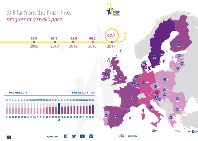 Η Ευρωπαϊκή Ένωση κινείται προς την κατεύθυνση της ισότητας των φύλων με ρυθμό σαλιγκαριού. Έχοντας φτάσει το δείκτη ισότητας στο 67,4 με ανώτατο τα 100, η ΕΕ έχει ακόμα πολλά περιθώρια βελτίωσης. Από το 2005, η επίδοση της ΕΕ αυξήθηκε μόνο κατά 5,4 μονάδες (+ 1,2 μονάδες από το 2015).