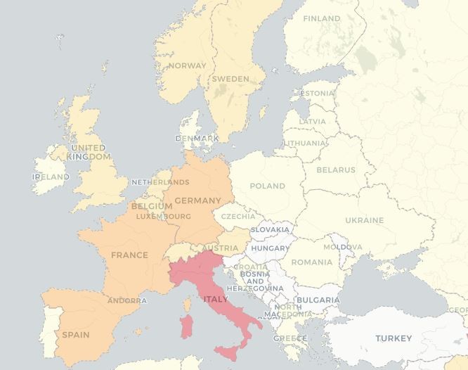 Το ιταλικό πρόβλημα είναι διαφορετικής τάξης μεγέθους σε σχέση με την υπόλοιπη Ευρώπη – τόσο σε αριθμό κρουσμάτων όσο και σε απώλειες σε ανθρώπινες ζωές. Η Ιταλία παραμένει η μόνη ευρωπαϊκή χώρα με θάνατο από κορωνοϊό.
