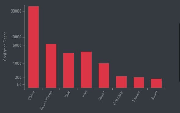 Τα επιβεβαιωμένα κρούσματα έχουν υπερδιπλασιαστεί από την Κυριακή – από 1128 σε 2546, ποσοστό αύξησης 226% – σύμφωνα με τα επίσημα στοιχεία όπως τα επεξεργάζεται και τα απεικονίζει το Πανεπιστήμιο της Ουάσινγκτον στο διαδραστικό real-time χάρτη.