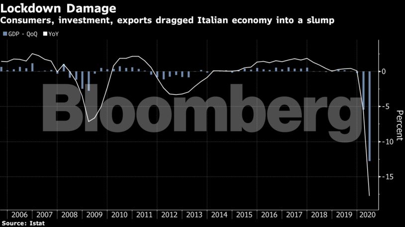Σε συρρίκνωση ρεκόρ η οικονομία της Ιταλίας καθώς οι ιταλικές επιχειρήσεις έβαλαν μαχαίρι στις επενδυτικές δαπάνες, ενώ βουτιά σημείωσε και η κατανάλωση, κατά τη διάρκεια του lockdown κατά το β’ τρίμηνο του έτους.