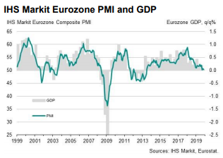 Ο συνδυαστικός δείκτης για την Ευρωζώνη υποχώρησε από το 50,6 τον Οκτώβριο στο 50,3. Είναι η δεύτερη χειρότερη ένδειξη από το 2013, όταν ξεκίνησε η τελευταία φάση σχετικής ανάκαμψης της Ευρωζώνης.