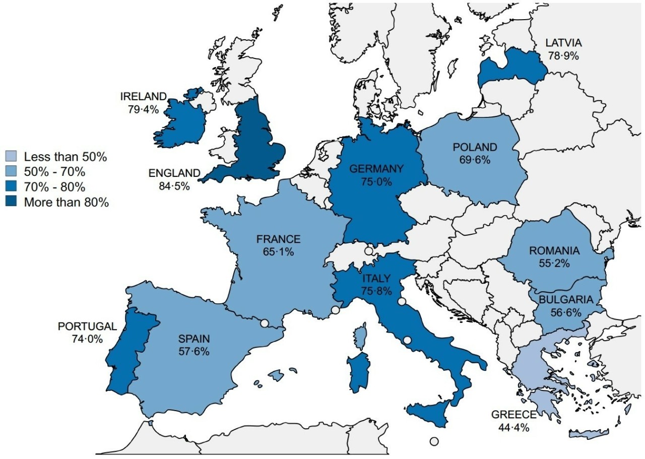 Την υψηλότερη βαθμολογία από τις δώδεκα χώρες σημειώνει η Αγγλία, όπου περισσότερα από οκτώ στα δέκα σπίτια είναι απαλλαγμένα από τον καπνό (84,5%). Ακολουθούν η Ιρλανδία (79,4%), η Λετονία (78,9%), η Ιταλία (75,8%) και η Γερμανία (75%). Στη μέση της λίστας βρίσκονται η Πορτογαλία (74%), η Πολωνία (69,6%) και η Γαλλία (65,1%). Αντίθετα, στην Ισπανία, τη Βουλγαρία και τη Ρουμανία περισσότερα από τέσσερα στα δέκα σπίτια επιτρέπουν το κάπνισμα. Στην τελευταία θέση βρίσκεται η Ελλάδα, όπου το ποσοστό των σπιτιών όπου δεν επιτρέπεται το κάπνισμα είναι κάτω από τη μέση (44,4%).