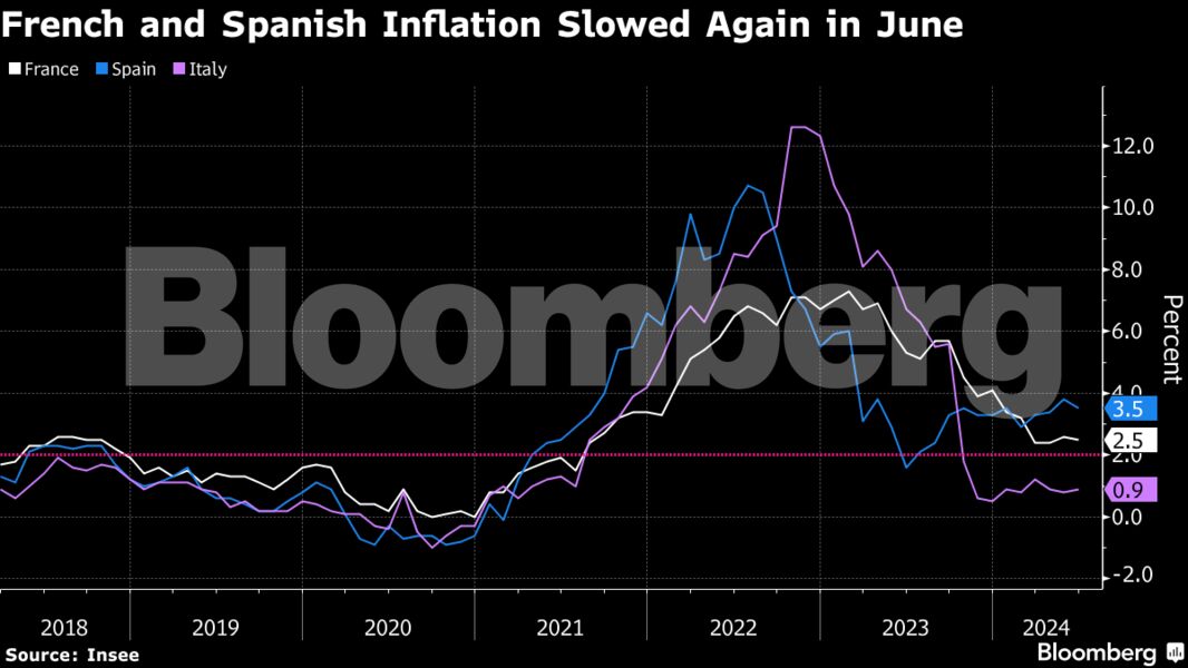 Στη Γαλλία, ο πληθωρισμός επιβραδύνθηκε καθώς επιβραδύνθηκε η αύξηση των τιμών των τροφίμων και της ενέργειας. Σύμφωνα με τον εθνικό δείκτη τιμών, ο πληθωρισμός υποχώρησε ακόμη περισσότερο από ό,τι στην εναρμονισμένη μέτρηση, φθάνοντας το 2,1% τον Ιούνιο.