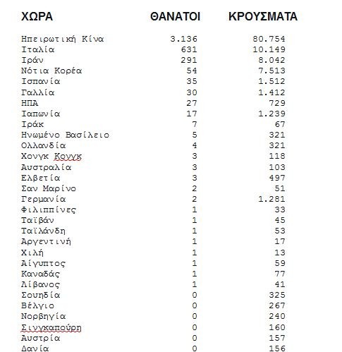 Ακολουθεί πίνακας με τον αριθμό κρουσμάτων και θανάτων από τον κοροναϊό ανά χώρα