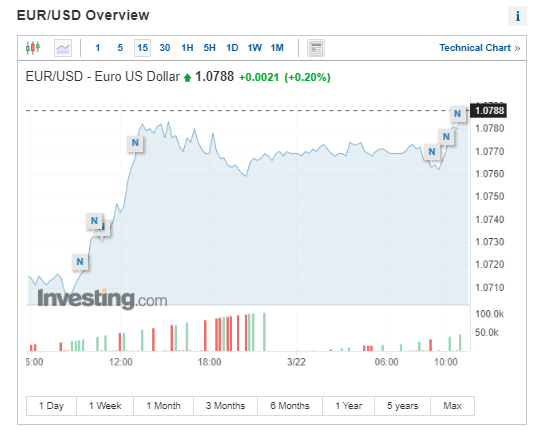 Το ευρώ ενισχύθηκε κατά έως 0,2% κατά το άνοιγμα των ευρωπαϊκών χρηματιστηρίων, ενώ αυτή την ώρα διαπραγματεύεται κοντά στο 1,08 δολ. ΗΠΑ (υψηλό 5 εβδομάδων).