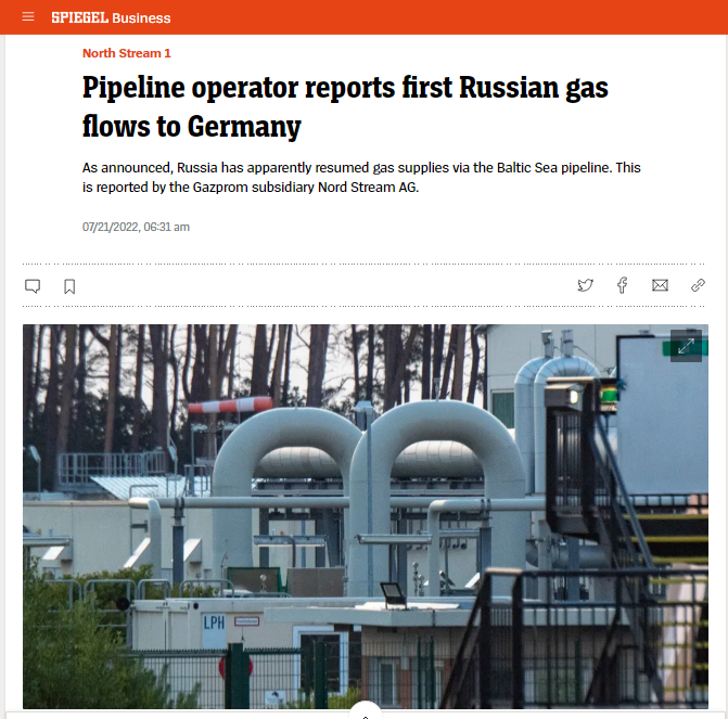 Η Ευρώπη ανέμενε με αγωνία την επιστροφή των προμηθειών φυσικού αερίου από τη Ρωσία, εν μέσω φόβων ότι η Μόσχα θα αποφασίσει να κρατήσει σχεδόν σχεδόν κλειστές τις στρόφιγγες, προκαλώντας πιθανώς ενεργειακή κρίση. Η Γερμανία κατηγόρησε το Κρεμλίνο ότι χρησιμοποιεί την ενέργεια ως «όπλο».