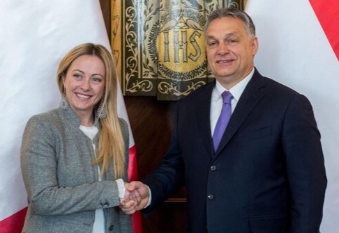Η Ιταλίδα πρωθυπουργός Τζόρτζια Μελόνι συναντήθηκε αργά σήμερα το απόγευμα, στο κυβερνητικό μέγαρο Παπλατσο Κίτζι, στην Ρώμη, με τον Ούγγρο ομόλογό της Βίκτορ Όρμπαν. Κύρια θέματα συζήτησης, ήταν η ουγγρική εκ περιτροπής προεδρία στην ΕΕ, η οποία αρχίζει την 1η Ιουλίου, το μεταναστευτικό, τα δυτικά Βαλκάνια, και η διαδικασία επιλογής των κατάλληλων προσώπων για τις κύριες θέσεις ευθύνης στους ευρωπαϊκούς θεσμούς.