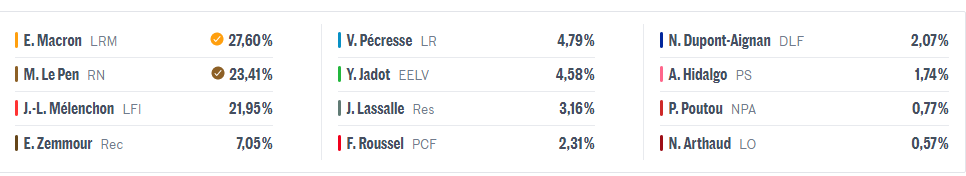 Ο Μακρόν εξασφάλισε ποσοστό 27,6%, η Λεπέν 23,4% ενώ η Μελανσόν 21,95%.