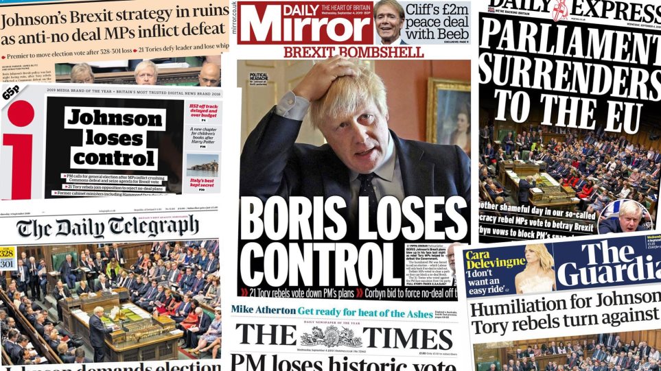 Στην πρωτοφανή ήττα του Μπόρις Τζόνσον και την πρόθεσή του να προχωρήσει σε προκήρυξη εκλογών εστιάζουν τα πρωτοσέλιδα των βρετανικών εφημερίδων λίγες ώρες μετά την ψηφοφορία στη Βουλή με την οποία η αντιπολίτευση ανέλαβε τον έλεγχο.