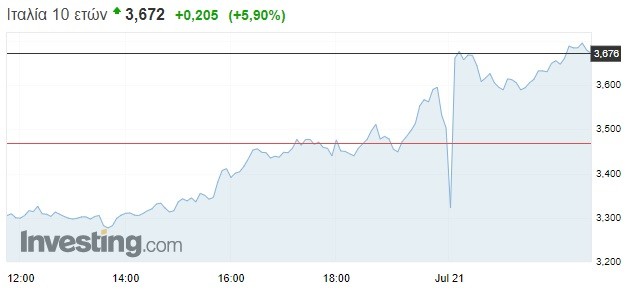 Δεν είναι τυχαίο ότι η απόδοση του 10ετούς ομολόγου της Ιταλίας σκαρφαλώνει σήμερα κατά 20 μονάδες βάσης και εκτινάσσεται στο 3,67%, το υψηλότερο επίπεδο από τα τέλη Ιουνίου. Τα spreads (απόκλιση από την απόδοση του γερμανικού ομολόγου), παράλληλα, αυξάνονται στις 239 μονάδες βάσης. Στο ελληνικό ομόλογο, αντίστοιχα, η απόδοση φθάνει στο 3,49% και τα spreads στις 221 μονάδες βάσης.