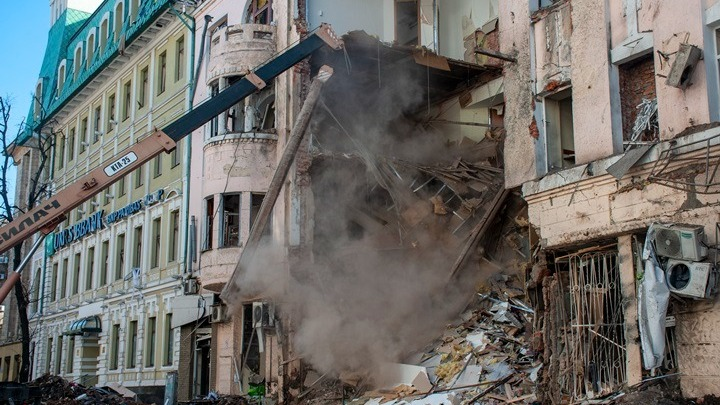 Ο πύραυλος αυτός προκάλεσε τη μία από τις τρεις εκρήξεις που ακούστηκαν νωρίς σήμερα το πρωί στην πόλη αυτή και κατέστρεψε τελείως τη μία πτέρυγα της πολυκατοικίας που βρίσκεται στο κέντρο του Μικολάιφ, όπου άνοιξε έναν τεράστιο κρατήρα.