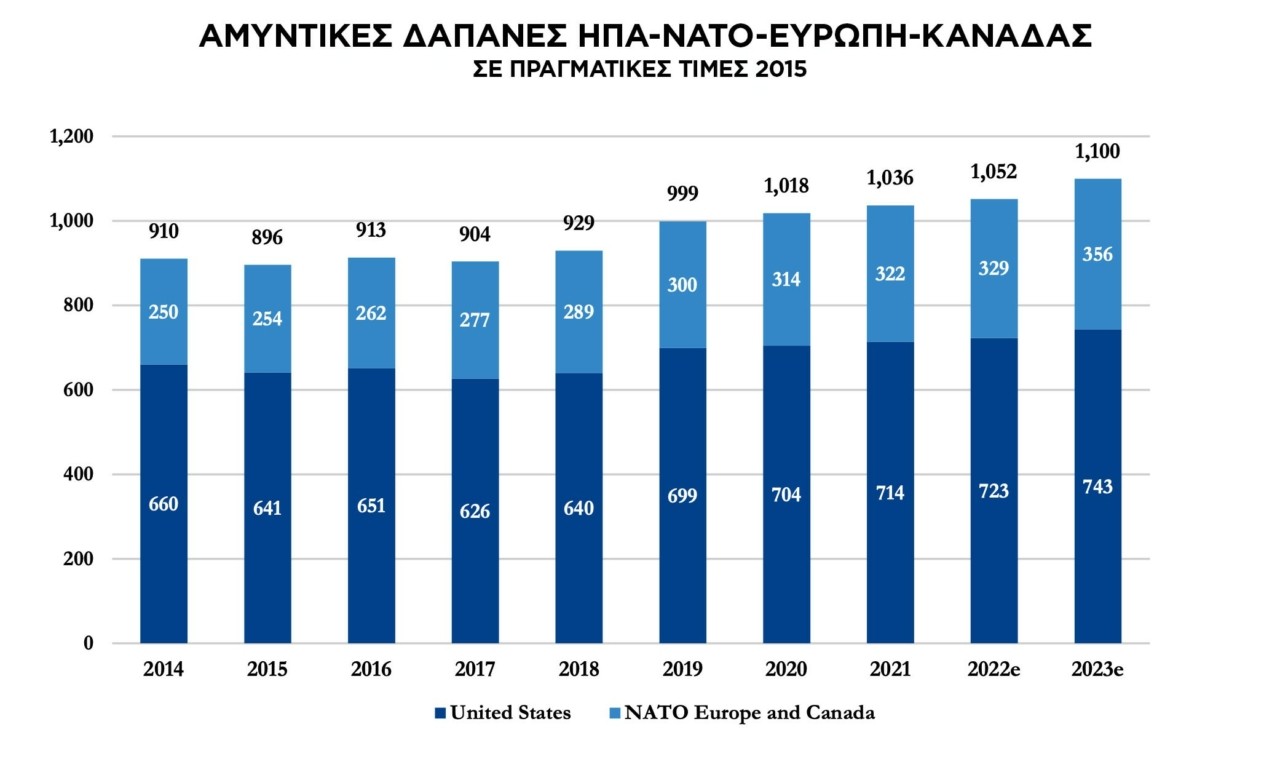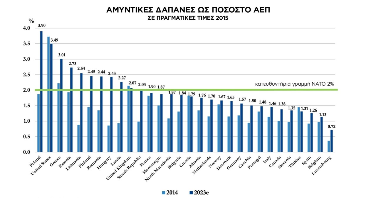 Έτσι, ενώ το 2014 μόνο επτά χώρες του ΝΑΤΟ υπερέβαιναν το 20% των δαπανών για εξοπλισμό ως ποσοστό των αμυντικών δαπανών, από το 2023 όλες οι χώρες του ΝΑΤΟ υπερβαίνουν αυτόν τον δείκτη. Επιπλέον, εννέα χώρες του ΝΑΤΟ, συμπεριλαμβανομένης της Ελλάδας, έχουν δαπάνες εξοπλισμού ως ποσοστό των αμυντικών δαπανών που υπερβαίνουν το 30%.