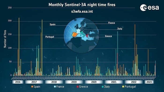 Τα στοιχεία του Άτλαντα δείχνουν κατά την τελευταία επταετία σημαντικό αριθμό πυρκαγιών στην Πορτογαλία, την Ιταλία, την Ελλάδα, τη Γαλλία και την Ισπανία, με τον υψηλότερο αριθμό πυρκαγιών να σημειώνεται στην Πορτογαλία τον Αύγουστο 2016 και τον Οκτώβριο 2017.