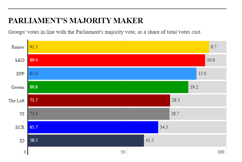 Οι συντηρητικοί και οι σοσιαλδημοκράτες ήταν (και είναι) οι μεγαλύτερες ομάδες στο Ευρωκοινοβούλιο, ωστόσο οι κερδισμένοι της πενταετίας ήταν οι φιλελεύθεροι του Renew Europe – που καταλαμβάνουν 102 από τις 705 έδρες. Οι ευρωβουλευτές του Renew κέρδισαν το 91% των ψηφοφοριών, στις οποίες συμμετείχαν – οριακά μπροστά από τους ευρωβουλευτές των Σοσιαλιστών, (ποσοστό 90%). Το Ευρωπαϊκό Λαϊκό Κόμμα – αν και πρώτο σε έδρες – κέρδισε το 85% των ψηφοφοριών.