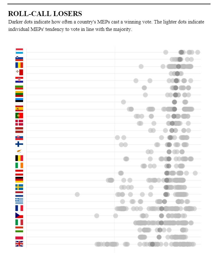 Οι απόψεις των ευρωβουλευτών του Λουξεμβούργου υποστηρίχθηκαν από την πλειοψηφία του κοινοβουλίου, πιο συχνά από οποιαδήποτε άλλη χώρα. Κατά μέσο όρο, οι μόλις έξι ευρωβουλευτές ήταν στη νικήτρια πλευρά, σχεδόν στο 90% των ψηφοφοριών. Από την άλλη, κανείς δεν διαφώνησε με τις αποφάσεις του κοινοβουλίου περισσότερο απ’ ότι οι βουλευτές του Ηνωμένου Βασιλείου – σχεδόν οι μισοί από αυτούς άλλωστε εκπροσωπούσαν το κόμμα του Brexit – για το σύντομο χρονικό διάστημα που βρίσκονταν εκεί.