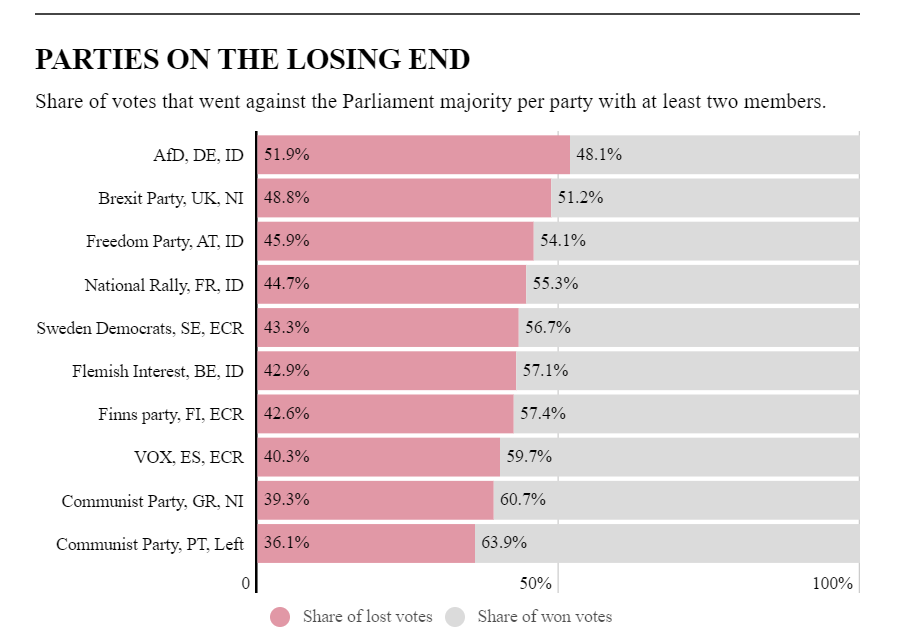 Όταν πλέον οι Βρετανοί αποχώρησαν, οι μεγάλοι νικητές στη διαφωνία αναδείχθηκαν οι ευρωβουλευτές από Ουγγαρία και Πολωνία (24%). Σε επίπεδο κόμματος, πάλι, κανείς δεν ήταν πιο σταθερά στην πλευρά των ηττημένων στις ψηφοφορίες του κοινοβουλίου όσο η ακροδεξιά «Εναλλακτική για τη Γερμανία» (AfD).