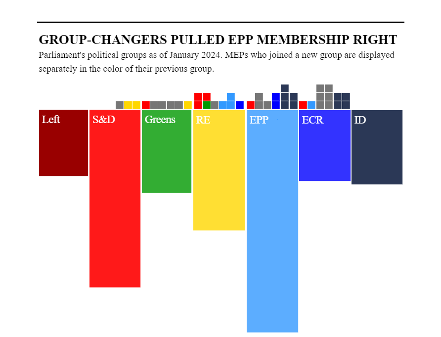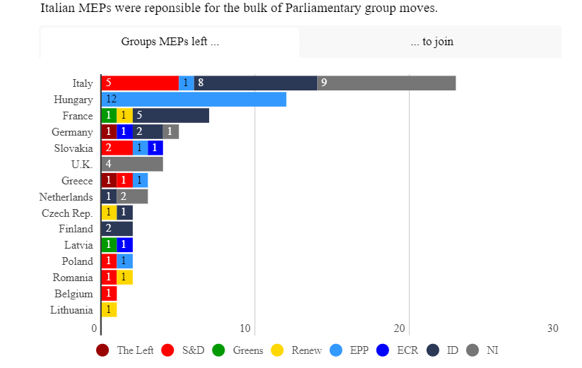 Το σώμα που εξελέγη το 2019 και αυτό που εκπροσωπεί σήμερα τους Ευρωπαίους πολίτες έχει διαφοροποιηθεί αισθητά. Το Brexit άλλαξε σε μεγάλο βαθμό τις ισορροπίες. Οι ευρωβουλευτές που παραιτήθηκαν από την πολιτική τους ομάδα και εντάχθηκαν σε μια άλλη, άλλαξε τις ισορροπίες. Τις μεγαλύτερες απώλειες κατέγραψε η ομάδα της Ταυτότητας και Δημοκρατίας, χάνοντας 19 ευρωβουλευτές, ενώ το Renew Europe απορρόφησε ευρωβουλευτές που προηγουμένως βρίσκονταν τόσο στα αριστερά όσο και στα δεξιά του. Σε απόλυτους αριθμούς, οι Ιταλοί ξεπέρασαν οποιαδήποτε άλλη χώρα με 23 μετακινήσεις.