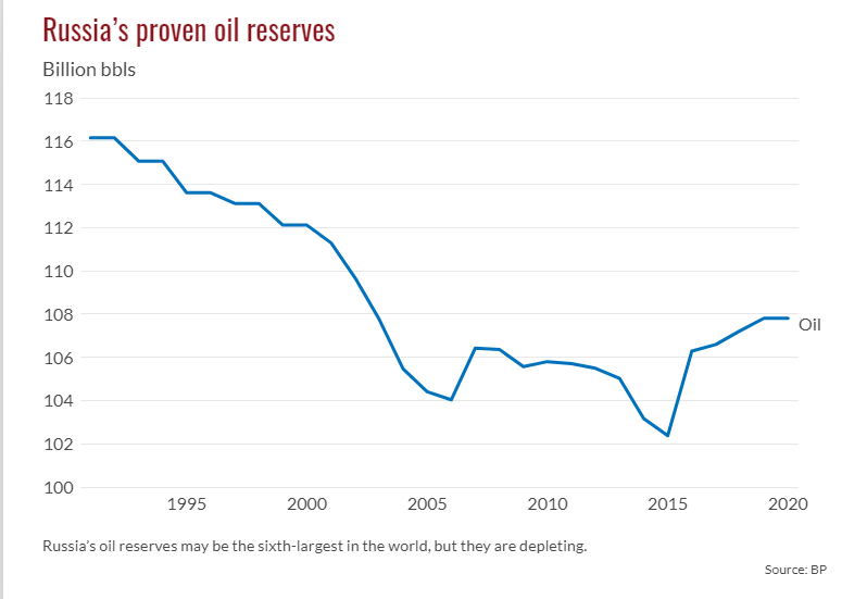Η Ρωσία είναι η τρίτη μεγαλύτερη παραγωγός πετρελαίου μετά τα ΗΑΕ και τη Σαουδική Αραβία (της αντιστοιχεί το 12% της παγκόσμιας παραγωγής). Ωστόσο, τα καταγεγραμμένα αποθέματά της είναι στην 6η θέση παγκοσμίως, πίσω από Βενεζουέλα, Σαουδική Αραβία, Καναδά, Ιράν και Ιράκ και συνεχώς μειώνονται. Το 2020 ήταν κατά 7% λιγότερα σε σχέση με το 1991, την ώρα που ΗΠΑ και Σαουδική Αραβία τα αύξησαν κατά 114% και 14% αντίστοιχα. Και προβλέπεται πιθανότητα περαιτέρω μείωσης, κυρίως λόγω των τεχνολογικών και οικονομικών κυρώσεων που της επιβάλλονται από το 2014.