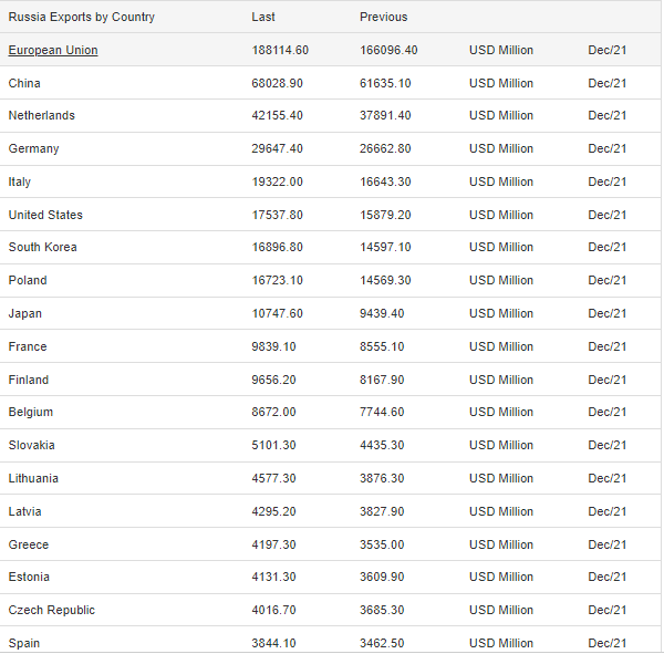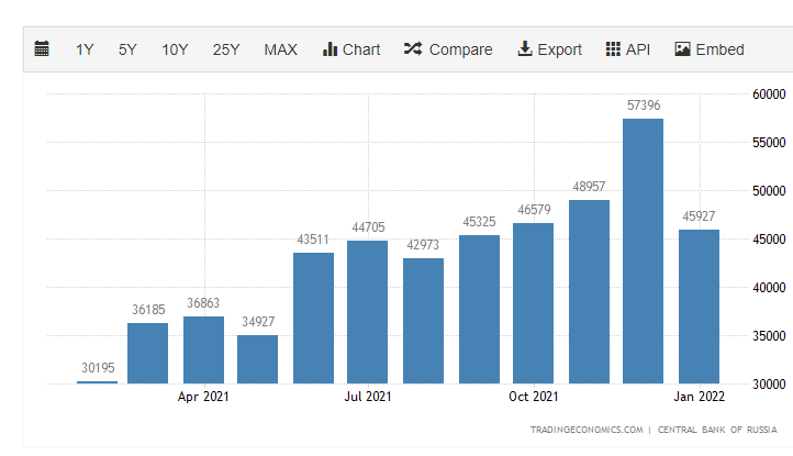 Οι εξαγωγές από τη Ρωσία αυξήθηκαν κατά 72% σε 45,93 δισεκατομμύρια δολάρια τον Ιανουάριο του 2022, πριν από την εισβολή της γειτονικής της Ουκρανίας και των κυρώσεων της Δύσης, σε σχέση με το αντίστοιχο διάστημα του 2021. Οι πωλήσεις αυξήθηκαν τόσο σε χώρες εκτός Κοινοπολιτείας Ανεξάρτητων Κρατών (CIS ή ΚΑΚ) στο 76,9%, όσο και σε χώρες της ΚΑΚ (41,3%ό). Τον Μάρτιο, η Ρωσία επέβαλε απαγόρευση εξαγωγών σε περισσότερα από 200 προϊόντα, συμπεριλαμβανομένων τηλεπικοινωνιών, ιατρικού εξοπλισμού, οχημάτων, αγροτικού και ηλεκτρικού εξοπλισμού, έως το τέλος του 2022 ως απάντηση στις κυρώσεις της Δύσης για εισβολή στην Ουκρανία.