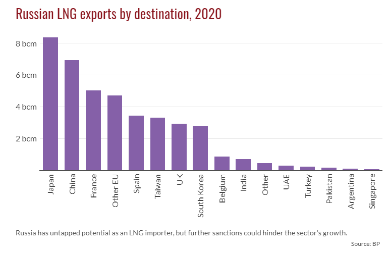 Παράλληλα, η Ρωσία επεκτείνει τις εξαγωγές της LNG και συγκαταλέγεται στους τέσσερις μεγαλύτερους εξαγωγείς LNG στον κόσμο (μετά το Κατάρ, την Αυστραλία και τις ΗΠΑ).