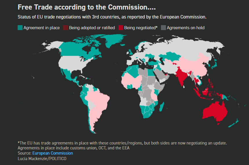 Από τον Δεκέμβριο, η δεύτερη Ευρωπαϊκή Επιτροπή της φον ντερ Λάιεν, η οποία διαχειρίζεται την εμπορική πολιτική για λογαριασμό των 27 μελών του μπλοκ, βρίσκεται σε τροχιά σύναψης συμφωνιών.