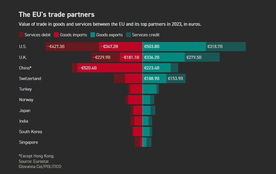 Η διατλαντική εμπορική σχέση είναι η μεγαλύτερη της Ευρώπης, με το αμφίδρομο εμπόριο να ανέρχεται σε 1,6 τρισεκατομμύρια ευρώ. Ακολουθούν το Ηνωμένο Βασίλειο, η Κίνα και η Ελβετία.